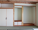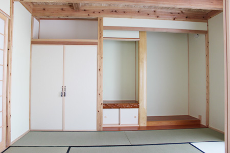~環境にやさしい家~ 外観写真の後ろに見えるのが由布山で、座敷からの景色は絶景です。 以前住んでいた家族の思い出が詰まった床柱を仏間の框に再利用しています。 壁は人や環境にやさしい天然素材のねりしっくいを使用しており、床・腰壁・天井に無垢材をふんだんに使用しています 将来の事を考慮して、2Fにミニキッチン・トイレ・洗面化粧台・大容量の小屋裏収納を施工しています。