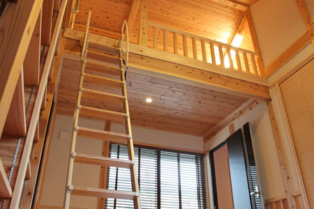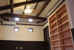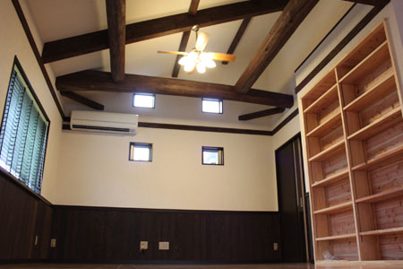 お施主様の希望通り、壁と天井には調湿性の優れた珪藻土、梁には杉の丸太など、様々な自然素材を採用しております。
