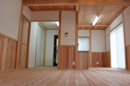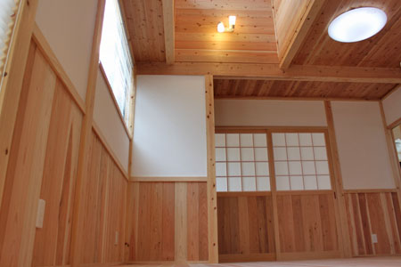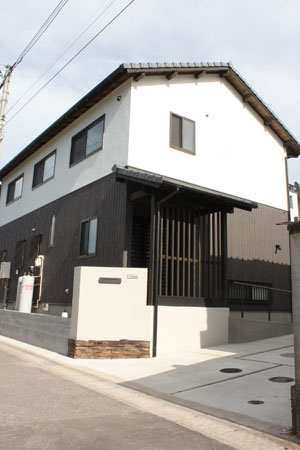 ~蔵屋敷風な家~ 和風がいいけど純和風でもなく古民家風でもない家がいい… そんな発想から生まれたのが蔵屋敷風の家です。 屋根にはしぶい銀色の陶器瓦を使い、玄関入り口のポーチ部分に取付けた木格子が家の顔となっています。 中は、床や天井は無垢の杉の木・柱はひの木・壁は漆喰で仕上げた自然素材の家です。 本物の蔵と同じように、時が経てば経つほど味わいや風合いが増してくる、それが蔵風の家です。