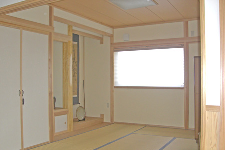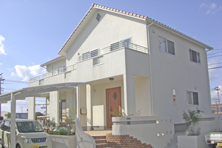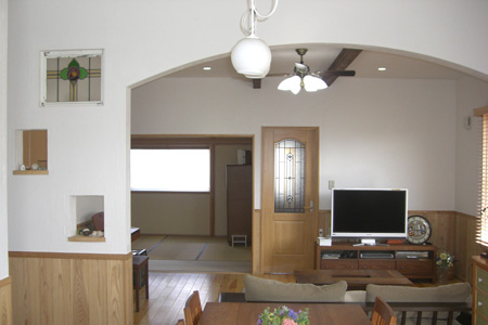 ~南欧風スタイルの家~ 南欧風スタイルの外観 無垢材の床に漆喰の壁が気持ちよいリビングダイニンリグ。 アーチ状の下り壁の横には、ステンドグラスとニッチのカウンターがアクセントに!! 杉板の腰壁がリビングに落着きをもたらしています。 伝統のよさを生かした本格和室には民芸調の畳を採用。