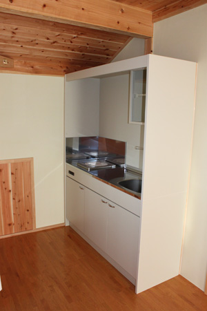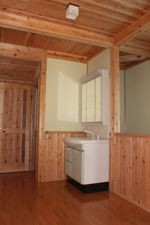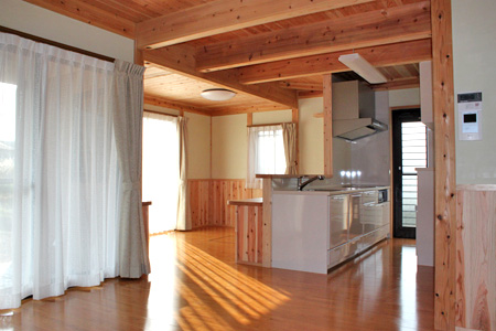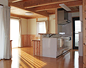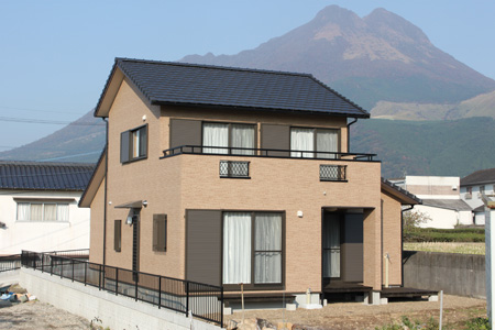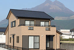 ~環境にやさしい家~ 外観写真の後ろに見えるのが由布山で、座敷からの景色は絶景です。 以前住んでいた家族の思い出が詰まった床柱を仏間の框に再利用しています。 壁は人や環境にやさしい天然素材のねりしっくいを使用しており、床・腰壁・天井に無垢材をふんだんに使用しています 将来の事を考慮して、2Fにミニキッチン・トイレ・洗面化粧台・大容量の小屋裏収納を施工しています。