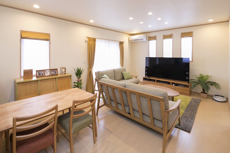65インチの大型テレビが置かれたリビングは、バランス良く配置された窓から光が優しく差し込む、広く明るい空間。ダウンライトの下、統一感のある木の家具が置かれ、ショールームのような美しさです。