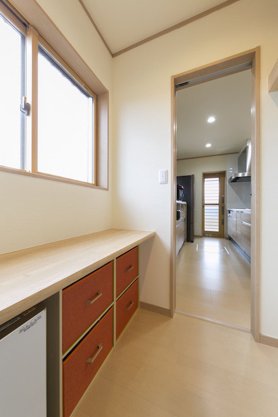 奥様希望の対面キッチンからは、廊下を通らず隣のアイロンがけや室内干しができる家事室、洗濯機のある洗面室へ移動できます。