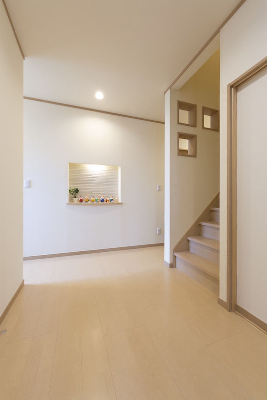 ともに24歳という若いKさん夫婦は1週間前に引っ越しを終えたばかり。新築ほやほやの家にすがすがしい木の香りが漂います。フローリングやドアはすべて木。廊下やリビングの白い壁は珪藻土の塗り壁で、コテの跡が暖かみのある印象です。