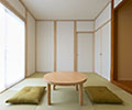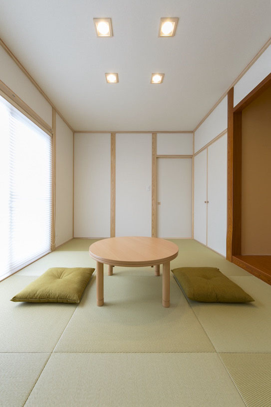 隣の和室は緑のない琉球畳。上部で色あせしにくい和紙素材で、イエローとグリーンの2色編み。木の床やドアに合わせて、和戸枠も全て木目調の樹脂サッシに。断熱性が高く、結露が生じにくいのが特徴です。