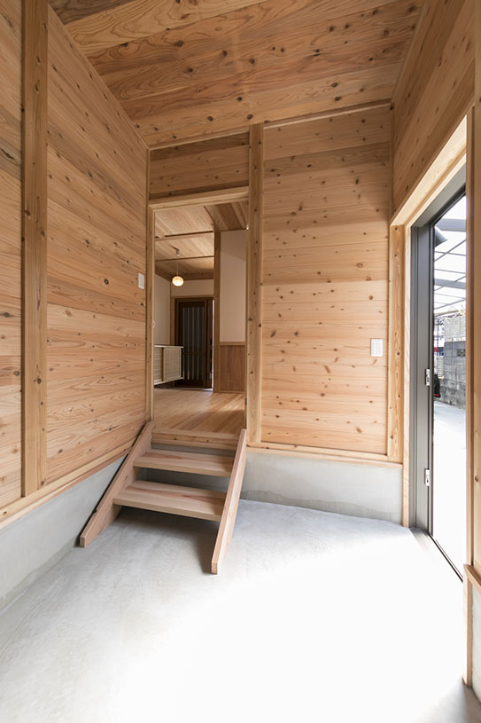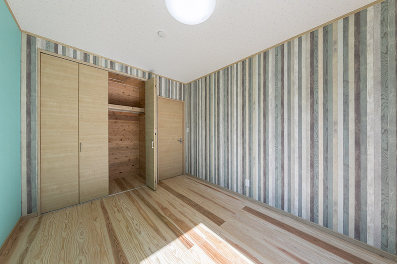 『雅(みやびハウス)ハウス』は、隅々まで天然素材を用いた健康住宅。構造材をはじめ、化粧材や見えない場所まで県産の無垢材で、木の温もりにあふれています。N邸の床は、美しい木目の厚み30㎜の杉板。子どもたちは、1年中素足で走り回れます。さらに収納もたっぷりあり、キャンプ用品や自転車などは、室内外から使える便利な土間の納戸へ。バルコニーは、天体望遠鏡が置けるよう大きく張り出したことで、軒となって駐車場から玄関まで雨の日でも濡れずに行き来でき、梅雨の時期も快適です。