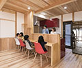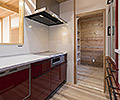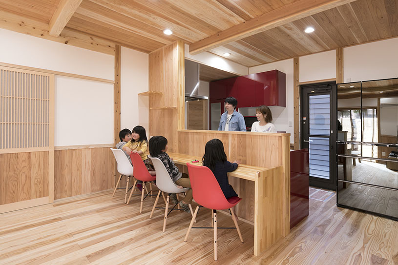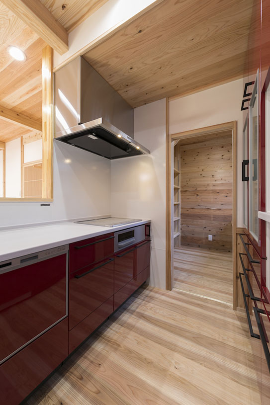 珪藻土の白壁と木に包まれた明るい空間に一際個性を放つのが、赤い対面キッチン。「ぜったいコレって決めていました」と嬉しそうに話す奥様のお気に入りです。食品庫のブラインドまで赤系に統一し、収納力も抜群です。奥様は対面キッチンから子どもたちがカウンターで勉強したり、外の境内で遊んだりする様子を見守る事ができます。さらに和室に設けた屋根付きの縁側は、洗濯物を干すだけでなく、日向ぼっこしながら談笑するのが楽しみな場所です。