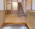 玄関に足を踏み入れると、艶やかな床と木の香りに包まれたホール。目の前に設えた飾り棚や靴箱、建具など昔ながらの味わいが感じられます。リビングの戸を開けると、広々としたくつろぎの空間が現れました。南北に連なるLDKと和室がつながり、開放感にあふれています。